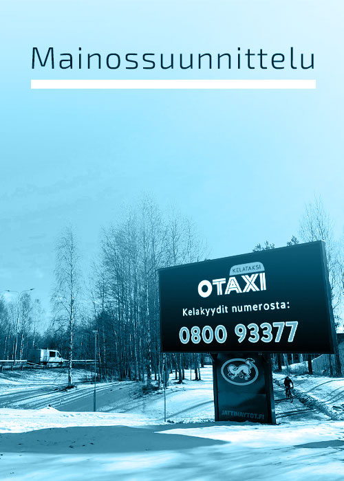 Olemme aidosti asiakasta kuunteleva ja joustava mainos- ja markkinointitoimisto. Teemme kaikkea yritysilmeen ideoinnista markkinoinnin toteutukseen saakka. Tervetuloa sivustollemme tutustumaan sekä meihin, että töihimme. Kannattaa olla yhteydessä matalalla kynnyksellä. Suunnitellaan yhdessä loistava tulevaisuus palveluillesi ja tuotteillesi!